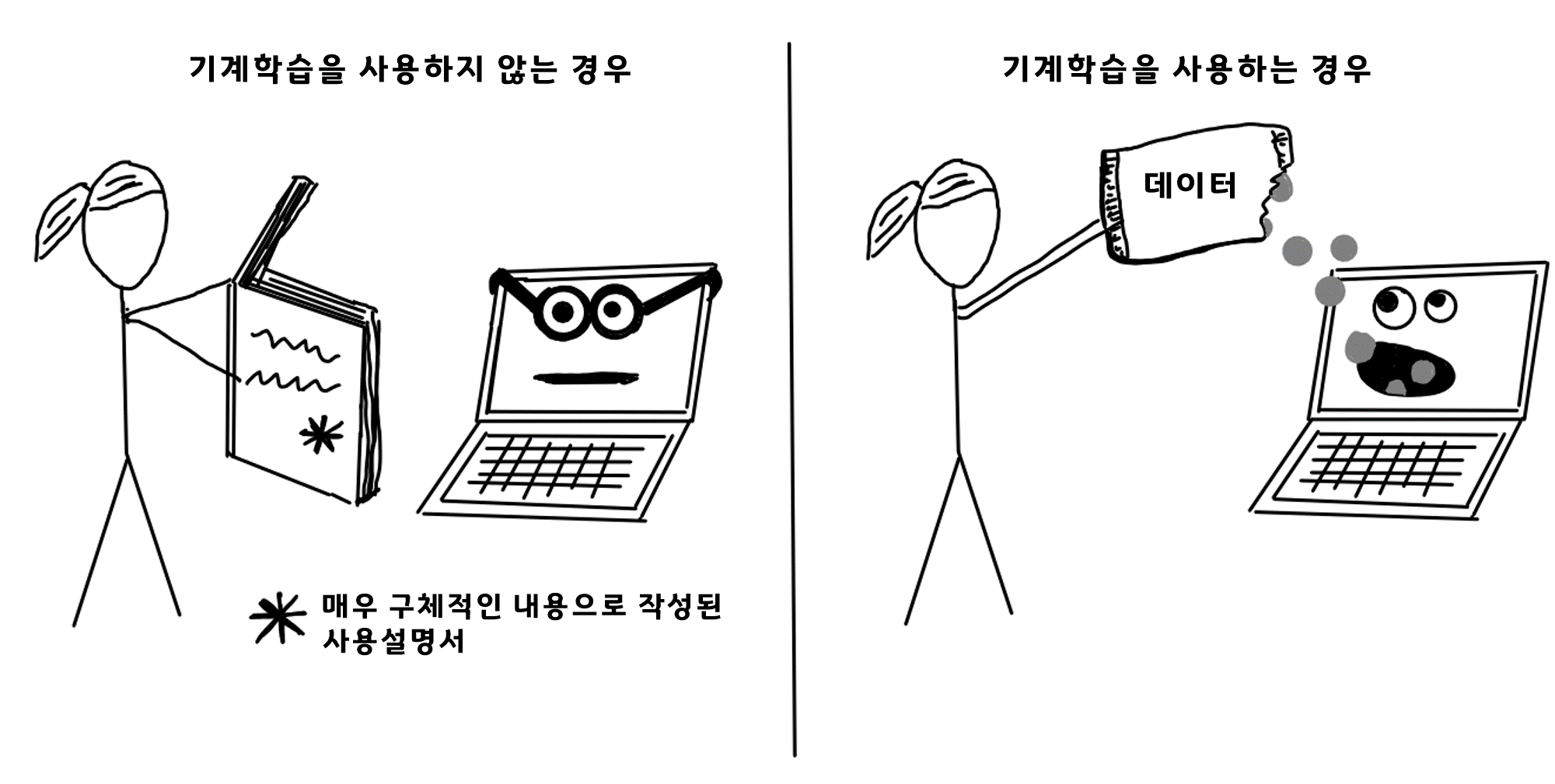 위 그림을 통해 기계학습을 구체적으로 설명하자면 왼쪽의 경우 기계학습을 사용하지 않을 때 사용자는 if-else문 등을 사용하여 각각의 경우에 대해 프로그램이 동작할 수 있도록 상세하게 알고리즘을 설계하면 컴퓨터는 구체적인 설명서 대로 프로그램을 실행합니다. 반면에 기계학습으로 컴퓨터를 동작시킬 경우 사용자는 컴퓨터에게 다량의 데이터를 제공하고 컴퓨터는 주어진 데이터를 수집하여 스스로 학습을 하게 됩니다.