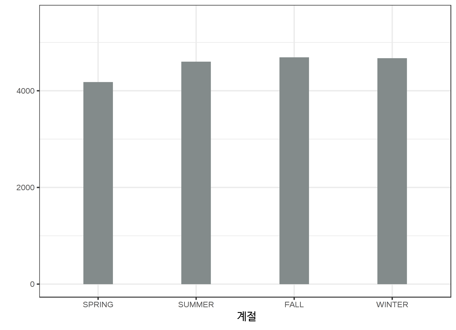 지금까지 우리는 수치적 특성값만 고려했습니다. 카테고리 특성값의 경우 부분의존성을 계산하기 매우 쉽습니다. 각 카테고리에 대해, 모든 데이터 인스턴스가 동일한 카테고리를 갖도록 함으로써 PDP 예측치를 얻습니다. 예를 들어 자전거 대여 데이터셋을 보고 계절의 부분의존도에 관심이 있다면 계절마다 하나씩 4개의 숫자를 얻습니다. "여름"의 값을 계산하기 위해, 모든 데이터 인스턴스의 기간을 "여름"으로 대체하고 예측값의 평균을 산출합니다.