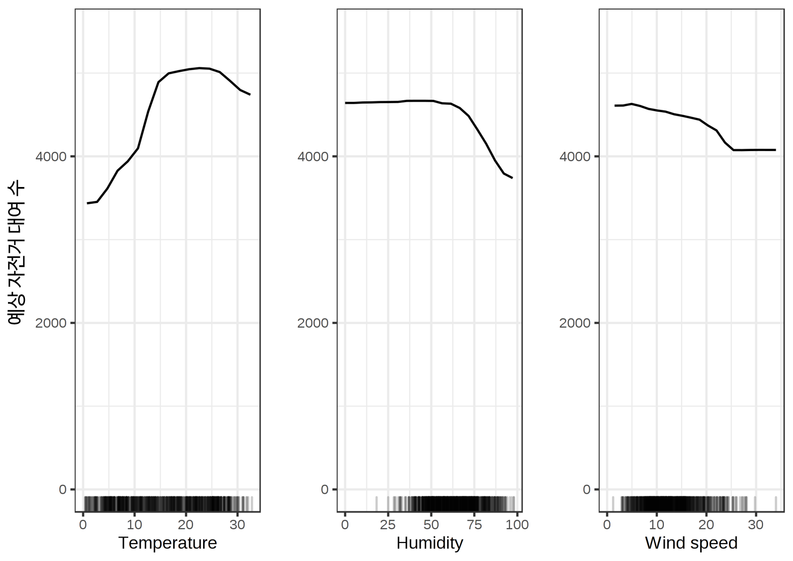 따뜻하지만 너무 덥지 않은 날씨에 이 모델은 평균적으로 많은 수의 자전거를 빌렸다고 예측하고 있습니다. 잠재적 자전거 이용객들은 습도가 60%를 넘을 때 자전거를 빌리는 것에 대해 점점 더 자제하게 됩니다. 또한, 바람이 많이 불수록 자전거 타기를 좋아하는 사람이 적어지는 것은 이치에 맞습니다. 흥미롭게도, 풍속이 25km/h에서 35km/h로 증가할 때 예상 자전거 대여 수는 감소하지 않지만, 학습 데이터는 많지 않기 때문에, 기계학습 모델은 아마도 이 범위에 대한 의미 있는 예측을 배울 수 없었을 것입니다. 적어도 직관적으로, 특히 풍속이 매우 높을 때, 풍속이 증가함에 따라 자전거의 수가 줄어들 것으로 예상할 수 있지요.