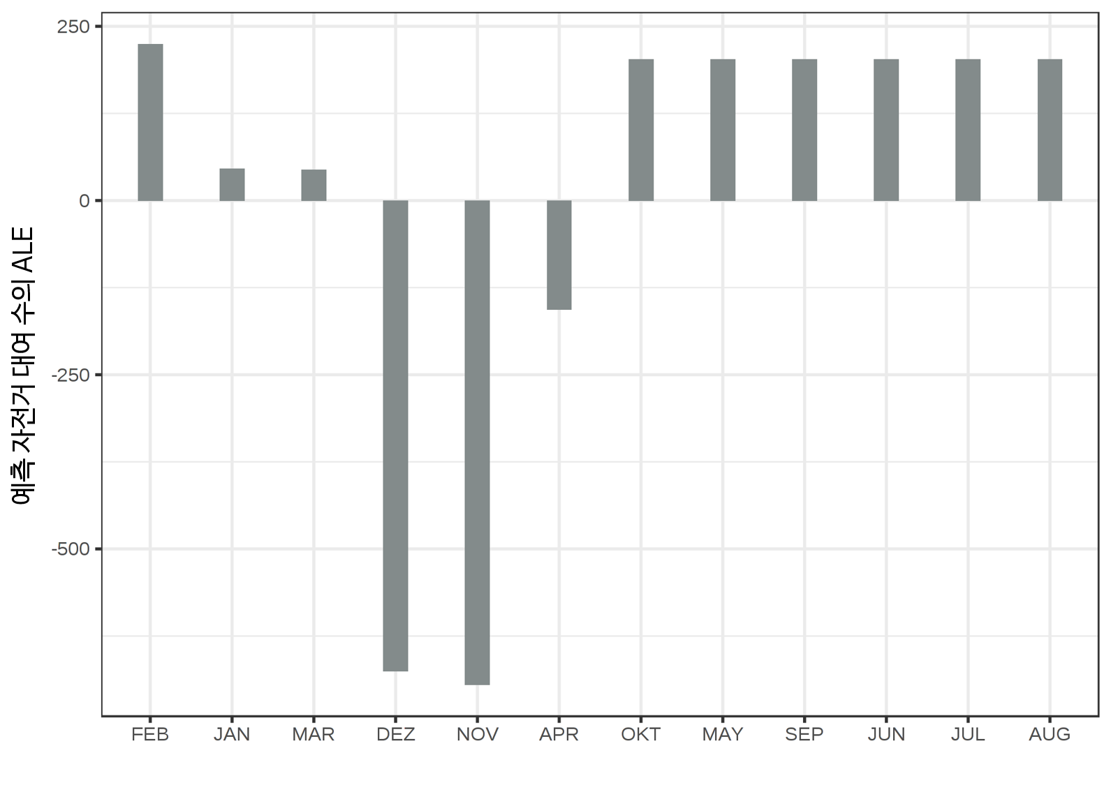 다음으로, 카테고리 특성값 대한 ALE 플롯을 봅시다. 각각의 월은 우리가 예측한 자전거 수에 대한 효과를 분석하고자 하는 카테고리 특성입니다. 논쟁의 여지가 있지만, 각각의 달들은 이미 일정한 순서를 가지고 있습니다(1월에서 12월). 그러나 만약 우리가 먼저 유사성에 의해 카테고리를 재정렬하고 그 결과를 계산하면 어떻게 되는지 보도록 합시다. 달은 온도나 휴일인지와 같은 다른 특성값에 근거하여 매월 일수의 유사성에 의해 정렬됩니다.
