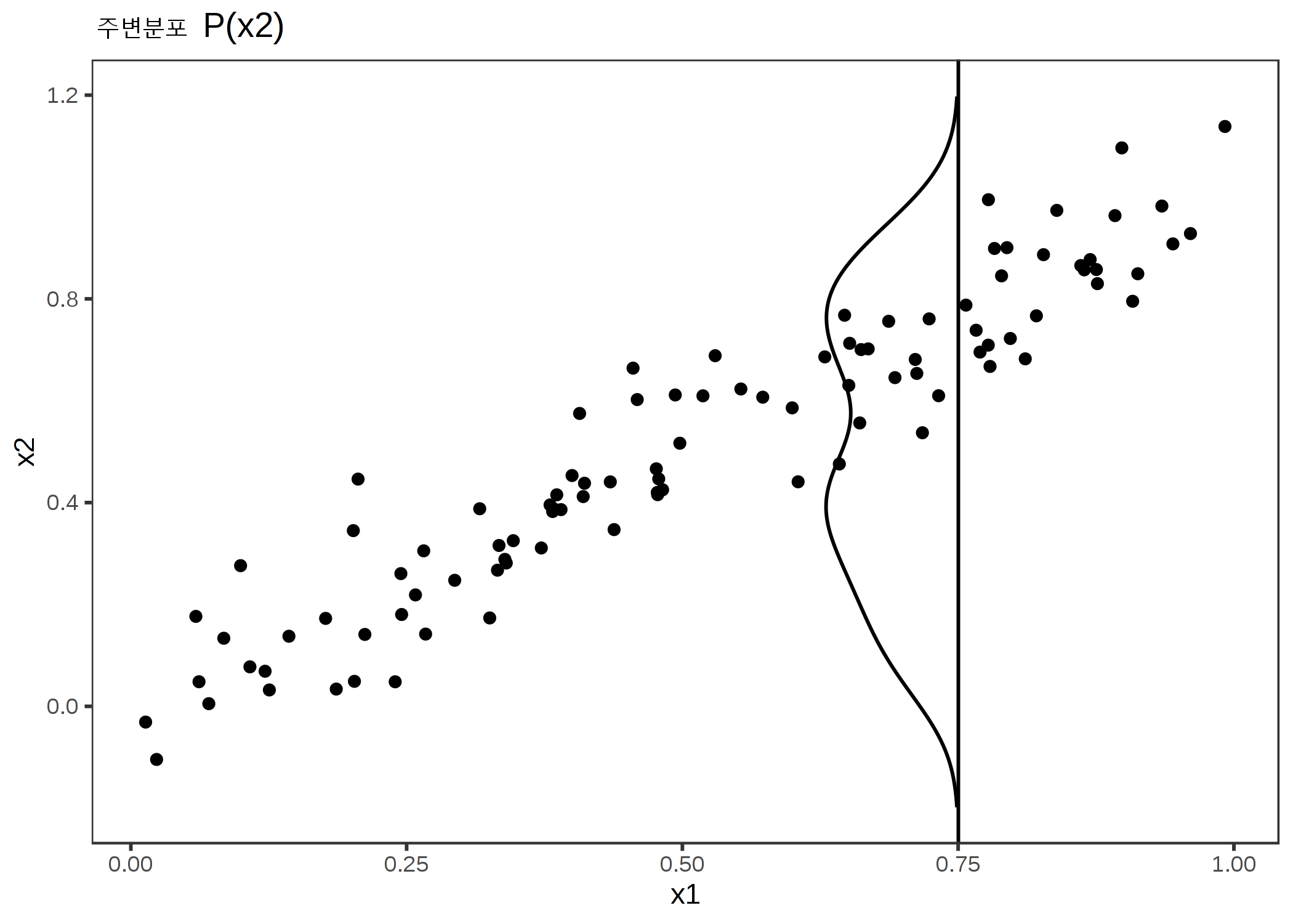 그런데 위의 모델이 x1 > 0.7, x2 < 0.3에서 이상하게 행동한다는 것은 흥미롭지 않나요? 아마도 그렇거나 아니라고 하실 것입니다. 이들은 물리적으로 불가능하거나 최소한 극히 가능성이 낮은 데이터 인스턴스들이기 때문에, 대개 이러한 인스턴스들을 조사하는 것은 큰 문제 없습니다. 그러나 테스트 분포가 약간 다를 수 있고 일부 인스턴스가 실제로 그러한 범위에 있다고 의심한다면 이 영역을 특성값 효과 계산에 포함시키는 것이 흥미로울 것입니다. 그러나 우리가 아직 데이터를 관찰하지 않은 영역을 포함시키는 것은 의식적인 결정일 수 밖에 없고 PDP와 같은 선택방법의 부작용이 되어서는 안될것입니다. 나중에 모델이 다른 분산 데이터에 사용될 것으로 의심될 경우 ALE플롯을 사용하여 예상되는 데이터의 분포를 시뮬레이션하는 것이 좋습니다.