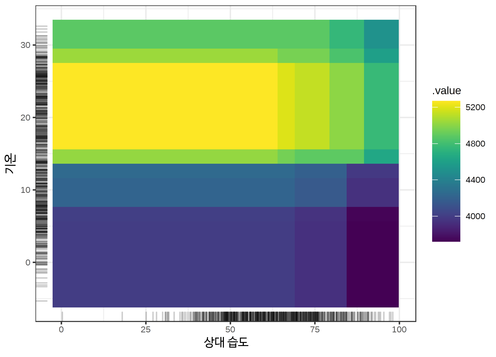 다음으로, 습도와 온도가 예측 자전거 수에 미치는 2차 효과를 고려합니다. 2차 효과는 두 특성값의 추가 상호작용 효과로 주요 효과를 포함하지 않는다는 점을 기억합니다. 이는 예를 들어 2차 ALE 플롯에서 높은 습도로 인해 평균적으로 예측 자전거 수가 감소하는 주요 효과를 보지 못한다는 것을 의미합니다.