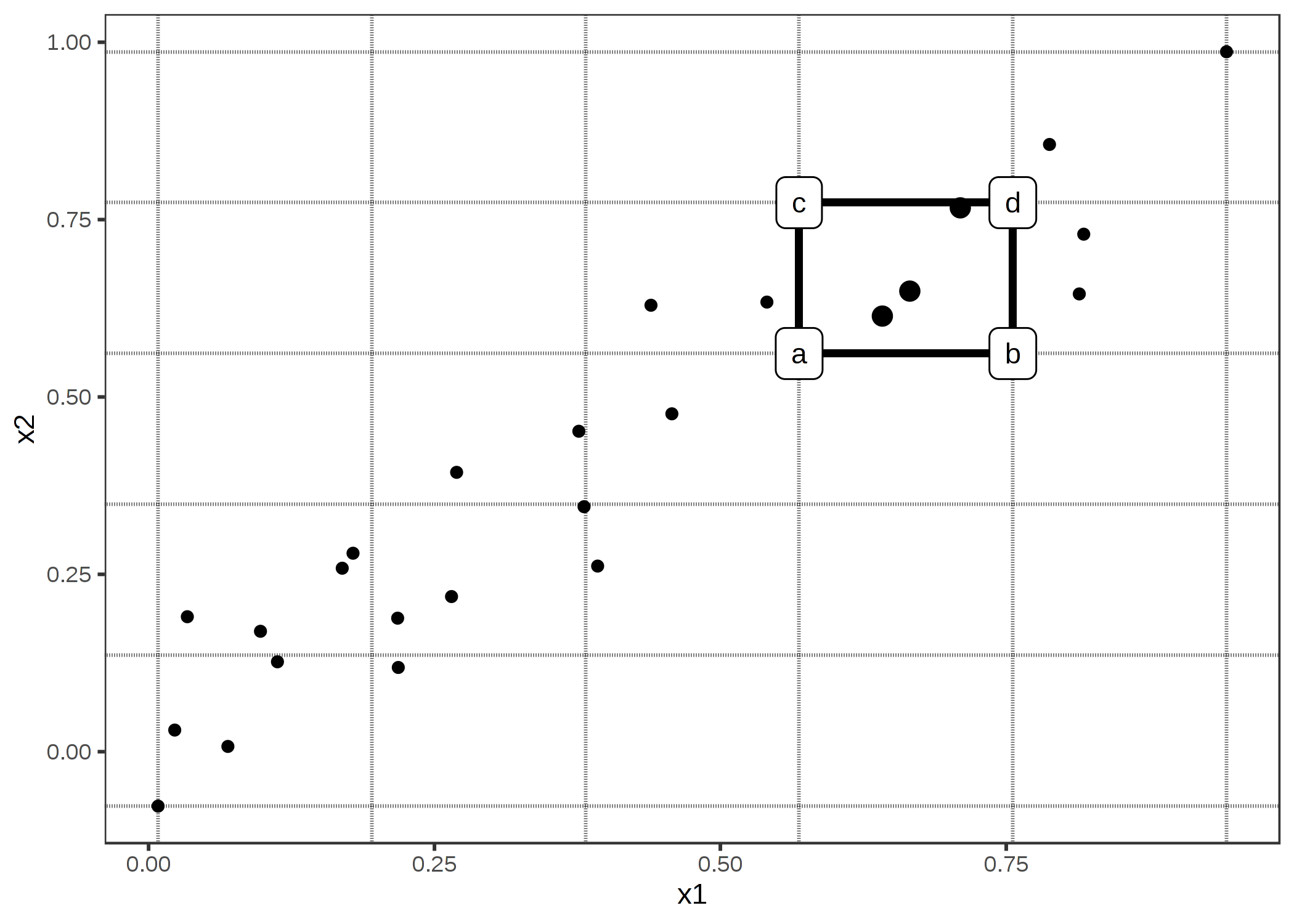 특성값의 상관 관계를 준수하는 특성값 효과 추정치를 얻으려면 어떻게 해야 할까요? 우리는 특성값의 조건부 분포에 대해 평균을 낼 수 있습니다. 즉, x1의 눈금값에서 우리는 비슷한 x1 값을 가진 인스턴스의 예측을 평균으로 나타냅니다. 조건부 분포를 사용하여 특성값 효과를 계산하는 솔루션을 주변분포 또는 M-플롯(한계 분포가 아니라 전제 조건에 기초한)이라고 합니다. 사실 M-플롯은 우리가 찾자 하는 해결책이 아닙니다. 왜 M-플롯은 이 문제를 해결하지 못할까요? 약 30㎡의 모든 주택의 예측을 평균화한다면, 주거지역과 방의 갯수의 결합효과를 추정하는 것에 상관관계가 있기 때문입니다. 거실이 주택의 예측가치에 영향을 미치지 않고 단지 방의 갯수에만 영향을 미친다고 가정합시다. M-플롯은 거실의 크기에 따라 방의 수가 증가하기 때문에 거실의 크기가 예측 값을 증가시킨다는 것을 보여줍다. 다음 그림은 M-플롯의 작동 방식을 상관관계에 있는 두 특성값에 대해 보여줍니다.