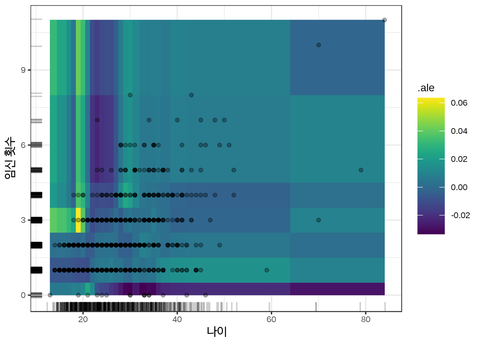 2차 ALE 추정치는 특성 공간(Feature space) 전체에 걸쳐 다양한 안정성을 가지며, 이는 어떤 방식으로도 시각화되지 않습니다. 그 이유는 셀에서 지역적 효과의 각 추정치가 다른 수의 데이터 인스턴스를 사용하기 때문입니다. 결과적으로, 모든 추정은 다른 정확도를 가지고 있습니다(그러나 여전히 가능한 최선의 추정치임). 이 문제는 주효과 ALE 플롯에 대해 덜 심각한 버전으로 존재합니다. 계량기를 격자로 사용한 덕분에 모든 구간에서 인스턴스 수는 동일하지만, 일부 영역에서는 짧은 구간이 많을 것이며 ALE 곡선은 더 많은 추정치로 구성될 것입니다. 그러나 전체 곡선의 큰 부분을 차지할 수 있는 긴 간격 동안, 상대적으로 적은 수의 예가 있습니다. 이것은 예를 들어 높은 나이에 대한 자궁경부암 예측 ALE 플롯에서 일어났다.