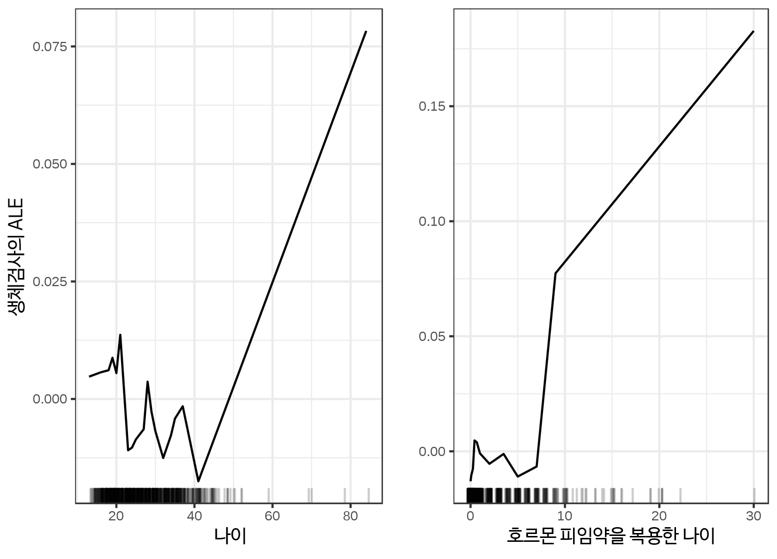 ALE 플롯은 예측의 변화량을 평균으로 나타내고 눈금(나중에 계산할 때 더 많이)에 이를 축적시킵니다.