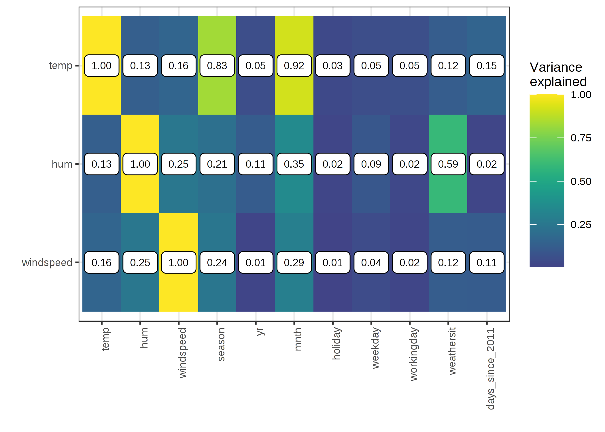 기온, 습도, 풍속과 다른 모든 특성값들의 상관관계를 살펴보자. 데이터에도 카테고리 특성값이 포함되어 있기 때문에 두 특성값이 모두 숫자일 경우에만 작동하는 Pearson 상관 계수를 사용할 수 없습니다. 대신 예를들어, 선형 모델을 훈련시켜 입력으로 다른 특성값들 중 하나를 기반으로 온도를 예측합니다. 그런 다음 선형 모델의 다른 특성값이 설명하는 분산을 측정하고 제곱근을 구합니다. 다른 특성값이 수치적이라면 결과는 표준 Pearson 상관 계수의 절대값과 같습니다. 그러나 "variance-explained"(ANOBA라고도 함, ANalysis of VAriance)의 이 모델 기반 접근법은 다른 특성값이 카테고리이더라도 효과가 있습니다. "variance-explained" 측정은 항상 0(연관 없음)과 1(다른 형상에서 온도를 완벽하게 예측할 수 있음) 사이에 있습니다. 온도, 습도 및 풍속의 설명된 분산을 다른 모든 특징들과 함께 계산합니다. 설명된 분산(상관)이 높을수록 PDP에서 더 많은 (잠재적) 문제가 발생합니다. 다음은 날씨 특성값이 다른 특성값들과 얼마나 강하게 관련되어 있는지를 시각화합니다.