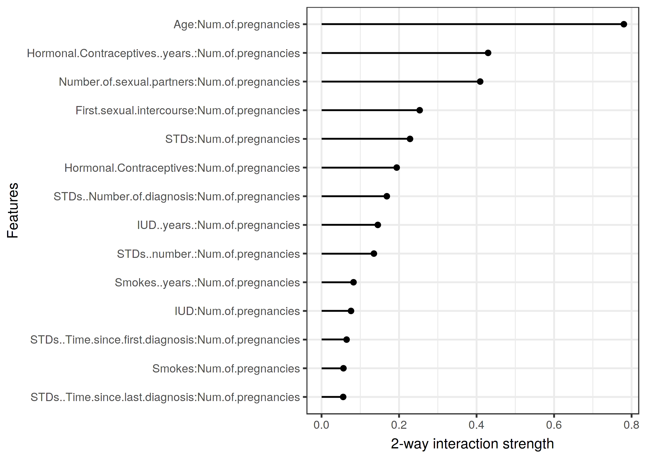 다음 예제에서는 분류 문제에 대한 상호작용 통계를 계산합니다. 몇 가지 위험 요소를 고려하여 자궁 경부함을 예측하도록 학습된 랜덤포레스트에서 특성간의 상호작용을 분석합니다.