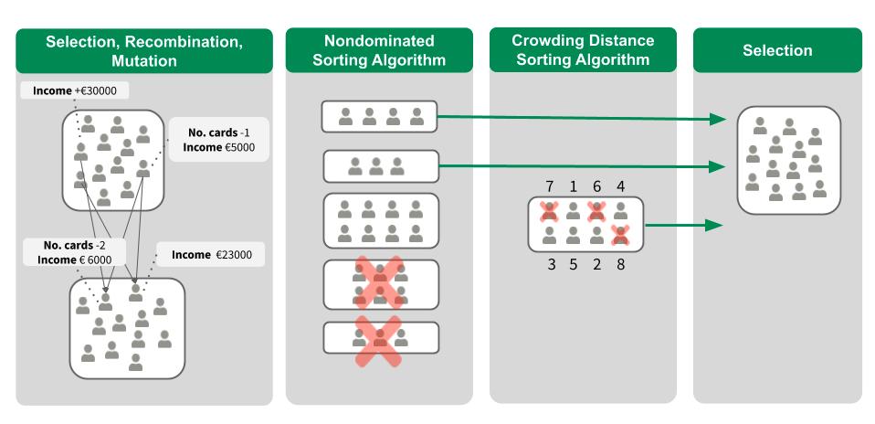 두 정렬 알고리즘의 순위를 고려할 때, 우리는 후보 중 가장 유망하거나 가장 다양한 절반을 선택합니다. 우리는 다음 세대를 위해 이 세트를 사용하고 선택, 재조합, 돌연변이(mutation) 과정부터 다시 시작합니다. 이러한 단계를 반복함으로써 우리는 낮은 객관적 가치를 지닌 다양한 유망한 후보들에게 접근하기를 원합니다. 이 집합에서 우리는 가장 만족스러운 것을 선택할 수 있고, 또는 어떤 특성과 얼마나 자주 변했는지를 강조함으로써 모든 반사실적 설명에 대한 요약을 제공할 수 있습니다.