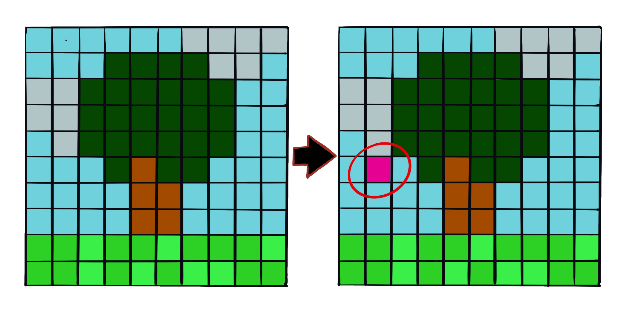 반사실적 요소와 유사하게, 1픽셀 공격은 원본 이미지 x에 근접한 수정된 예제 x'를 찾지만, 예측은 적대적 결과로 변경됩니다. 그러나 근접성의 정의는 서로 다릅니다. 단일 픽셀만 변경할 수 있습니다. 1픽셀 공격은 미분 진화를 통해 어떤 픽셀을 어떻게 변경해야 하는지 파악합니다. 미분 발전(Differential evolution)은 생물 종의 진화에서 느슨하게 영감을 받습니다. 후보 솔루션이라고 불리는 개체군은 솔루션이 발견될 때까지 세대별로 재결합합니다. 각 후보 솔루션은 픽셀 수정을 인코딩하고 5개 요소의 벡터, 즉 x 좌표와 y 좌표와 빨강, 녹색, 파랑 값으로 표현됩니다. 탐색은 예를 들어 400개의 후보 솔루션(= 픽셀 수정 제안)으로 시작하여 다음 공식을 사용하여 상위 세대에서 새로운 세대의 후보 솔루션(자녀)을 생성합니다.