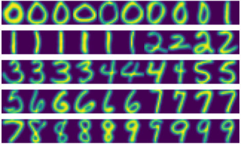 실제 프로토타입을 보면 이미지의 숫자와 번호가 다르다는 것을 눈치 챌 수 있습니다. 때문에 프로토 타입은 정해진 수의 전체 데이터셋을 넘나들며 검색하는 것이 아니라 클래스당 정해진 번호로 검색되된 것입니다. 이는 예상대로, 프로토 타입은 숫자를 쓰는 다른 방법을 보여 줍니다.