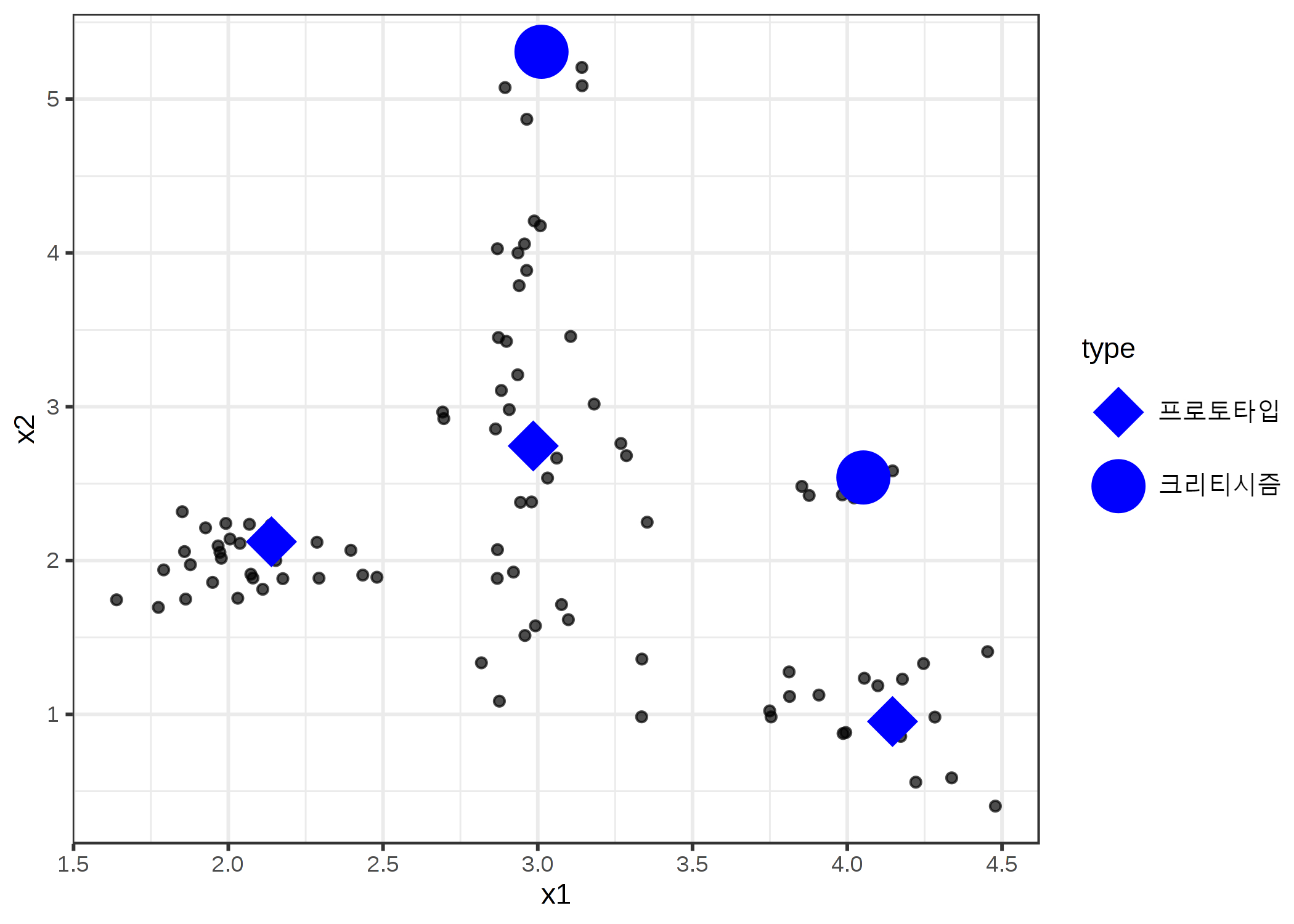 프로토타입과 크리티시즘은 수학적으로 다르게 정의되지만, 그 차이는 컷오프 값(프로토타입의 수)을 기반으로 합니다. 데이터 분포를 포함하기에 너무 적은 수의 프로토타입을 선택했다고 가정합니다. 그 크리티시즘들은 그렇게 잘 설명되지 않는 부분에서 끝날 것입니다. 하지만 프로토타입을 더 추가한다면 동일한 영역에 속하게 될 것입니다. 모든 해석은 크리티시즘이 기존 프로토타입과 (임의) 컷오프 값에 크게 좌우된다는 점을 고려해야 합니다.