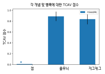 - 랜덤 CAV에 의해 생성된 다른 \(N\) TCAV 점수에 대해 \(N\) TCAV 점수에 양면 t-test를 적용합니다. 랜덤 CAV는 랜덤 데이터셋을 개념 데이터셋으로 선택하여 얻을 수 있습니다.