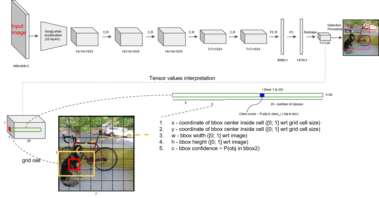 위의 예제 그림에 따르면 7 x 7의 그리드셀 기반의 텐서가 결과값으로 나오며 각 그리드셀은 길이 30의 벡터로 이루어진 텐서임을 알 수 있습니다.