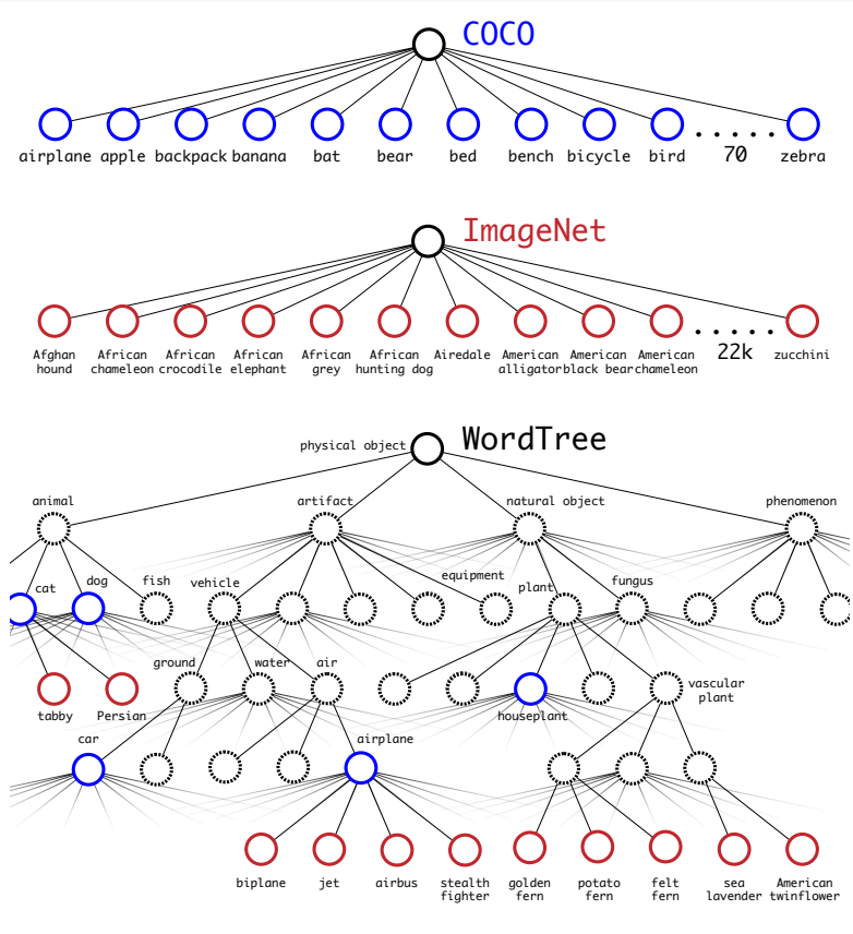 저자는 많은 양의 Label의 속성들을 WordTree 방식을 사용하여 Label을 마치 Tree 방식으로 세부 구분이 되도록 구성하였습니다. 이로서 대분류의 카테고리를 파악할 수 있어 Multi-label을 학습할 수 있게 하였습니다.