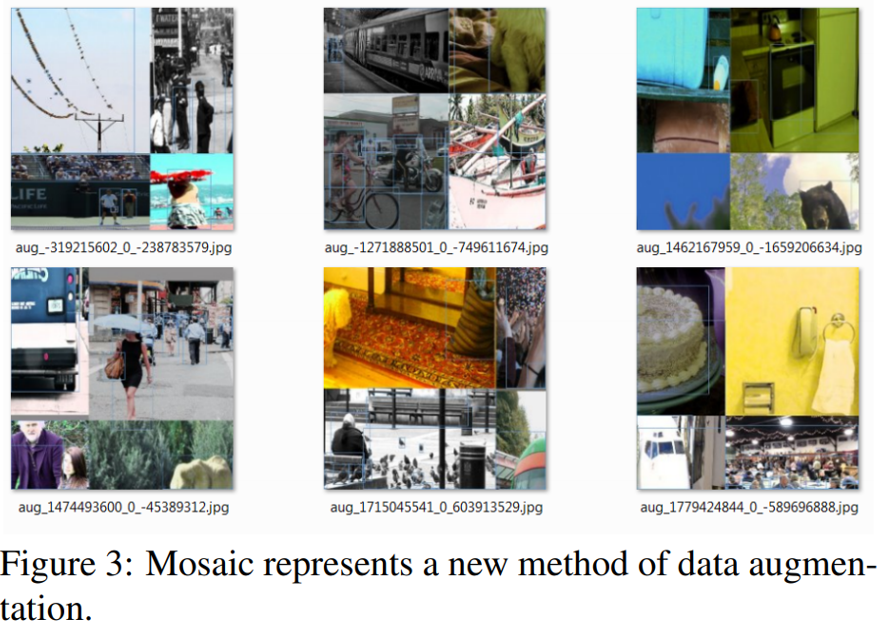 Mosaic 방법을 사용하여 4개의 이미지가 학습될 수 있도록 하여 batch-size를 줄여 많은 이미지들을 학습할 수 있게 하였습니다. 마치 한 장의 이미지에 4가지의 사진을 학습시켜 단조로운 한 장의 사진만으로 학습하는 것보다 더 많은 정보들을 다양한 위치에서 학습할 수 있게 하였습니다.