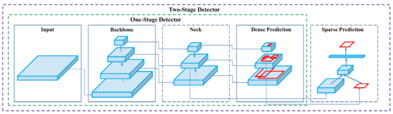 YOLOv4의 전체적인 구조는 다음과 같이 되어 있습니다. 아래의 이미지는 일반적인 객체 감지 알고리즘들의 전반적인 모습들을 나타낸 자료입니다.