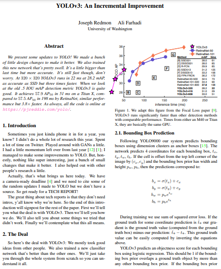 YOLO9000이 발표된지 1년만인 2019년, 레드몬은 YOLOv3 논문을 아카이브에 공개합니다. 공개된 그의 논문은 보편적인 논문에서는 결코 볼 수 없는 물음표를 쓴다던가 독특한 소제목을 사용한다던가의 특징을 나타내고 있지만 2021년 기중 9000회 이상의 피인용수를 자랑할 정도로 Object Detection 분야에서 막대한 영향력을 보여주고 있습니다.
