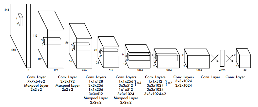 총 24개의 CNN 레이어 계층으로 구성되어 있으며, 기존 신경망인 GoogLeNet을 사용하여 이미지 분류에 사용하였습니다. 위 구조의 신경망을 좀 더 간단하게 표현하면 아래와 같은 단계로 구성되어 있습니다.