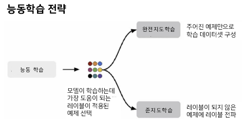 능동학습 전략은 모델이 학습하는 데 가장 도움이 되는 레이블이 적용된 예제를 선택하여 동작합니다. 완전 지도학습 설정에서 학습 데이터셋은 레이블이 지정된 예제로만 구성됩니다. 준지도학습 설정에서는 이러한 예제를 활용하여 레이블 전파를 수행하므로 능동학습 외에도 이를 수행할 수 있습니다.
