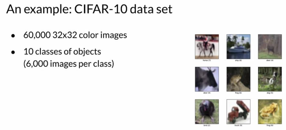 CIFAR는 캐나다 고등연구기관입니다. CIFAR-10 데이터셋은 기계 학습 모델과 컴퓨터 비전 모델을 학습시키는 데 일반적으로 사용되는 이미지 모음입니다. 머신러닝 연구에 가장 널리 사용되는 데이터셋 중 하나입니다. CIFAR-10에는 60,000개의 32 x 32 사이즈 컬러 이미지가 포함되어 있습니다. 각 클래스마다 6000개의 이미지를 가진 10개의 클래스가 있습니다.