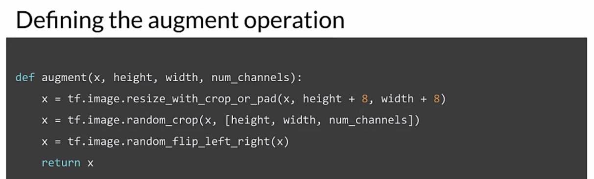 컬러 이미지는 텐서이기 때문에 Tensorflow는 이미지 데이터셋에서 데이터 증강을 수행하는 데 매우 유용한 함수를 제공합니다. 왼쪽, 오른쪽 플립을 수행하는 단계를 캡슐화한 코드 덩어리를 살펴보겠습니다. 먼저 이미지 데이터셋을 증강시키는데 사용할 함수를 정의합니다. 그런 다음 이미지 크기를 조정하거나 자를 수 있는 crop_or_pad와 함께 tf.image.size를 사용합니다. 이 경우 pad를 적용하겠습니다. tf.image.random 자르기는 모든 채널에서 가로세로 높이의 자르기를 생성합니다. 그리고 tf.image.random을 왼쪽으로, 오른쪽으로 뒤집으면 왼쪽이나 오른쪽으로 뒤집는 것과 같은 동작을 합니다. 따라서 이 함수는 데이터셋에 추가할 변경된 이미지를 리턴합니다.