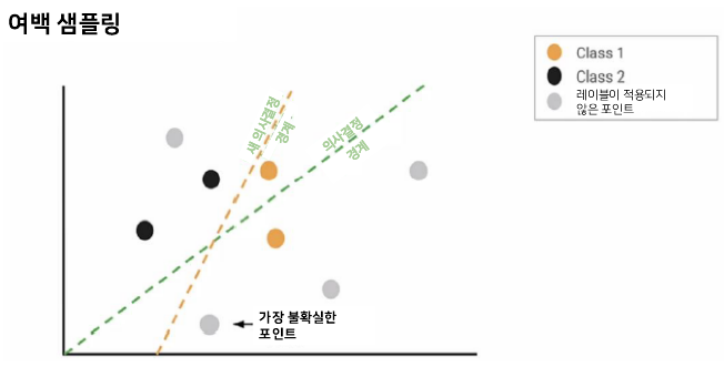 여백 샘플링(Margin sampling)은 지능형 샘플링을 수행하는 데 널리 사용되는 기술 중 하나입니다. 이 예제에서 데이터는 각각 두 개의 클래스 중 하나에 속하며 레이블이 없는 데이터 포인트도 있습니다. 이 설정에서 가장 간단한 전략은 단순하게 만드는 이진 선형 분류기 모델을 학습시키는 것입니다. 우리는 선형 모델만을 예로 들겠습니다. 모델을 라벨이 붙은 데이터로 훈련시킬 것이고, 이 모델은 우리에게 의사결정 경계를 나타낼 것입니다. 레이블이 없는 데이터 중에서 가장 불확실한 데이터 포인트는 의사결정 경계에 가장 가까운 점입니다. 능동학습을 통해 다음에 레이블을 지정하여 데이터셋에 추가할 가장 불확실한 포인트를 선택할 수 있습니다. 이제 이 새로운 레이블링된 데이터 포인트를 데이터셋의 일부로 사용하여 모델을 재교육하여 새로운 분류 경계를 학습합니다. 경계를 이동하면 모델은 이러한 클래스를 분리하는 방법을 조금 더 잘 학습합니다. 그런 다음 가장 불확실한 데이터 포인트를 다시 찾고 모델이 개선되지 않을 때까지 프로세스를 반복합니다.