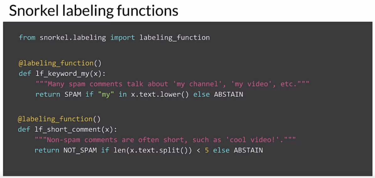 이번에는 간단한 레이블링 함수 몇 가지를 코드에서 살펴보겠습니다. 여기서는 스노클을 이용하여 스팸에 레이블을 붙이는 함수를 간단하게 만드는 방법을 보여드리겠습니다. 첫 단계는 스노클에서 레이블벨링 함수를 가져오는 것입니다. 그리고 이 함수의 레이블링으로 만약 'my'라는 단어가 포함되어 있다면 스팸 메시지를 보냅니다. 이는 보여주기 쉬운 예제이므로 'my'가 있는 메시지는 스팸일 필요가 없습니다. 그렇지 않으면 함수가 기권되어 반환되며, 이는 레이블이 무엇이어야 하는지에 대한 의견이 없음을 의미합니다. 두 번째 함수는 메시지 스팸이 5단어보다 길 경우 레이블을 지정합니다. 그래서 여기서 보이고자 하는 것은 레이블이 어떻게 되어야 하는지에 대한 결론에 도달하기 위해 여러 가지 레이블링 함수를 사용하고 있었다는 것입니다.