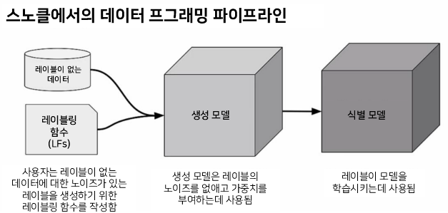 따라서, 레이블이 지정되지 않은 데이터부터 시작하기 때문에 실제 레이블을 알 수 없습니다. 그 다음 하나 이상의 약한 지도 출저를 혼합하여 추가합니다. 이러한 출저는 노이즈가 많고 불완전한 자동 레이블링을 구현하는 휴리스틱 접근 절차 방법들의 리스트입니다. 주제 전문가는 일반적으로 탐지 범위 세트와 탐지 범위 세트에 대한 실제 레이블의 예상 확률로 구성된 이러한 휴리스틱을 설계하는 가장 일반적인 출처입니다. 결정론적 레이블 대신 휴리스틱 또는 레이블링 함수를 사용합니다. 노이즈가 있다는 것은 레이블이 레이블링된 데이터의 레이블에 대해 사용되었던 100개의 확실성이 아닌 특정 확률을 가지고 있음을 의미합니다. 주요 목표는 각 지도 출저의 신뢰도를 배우는 것이며, 이는 생성 모델을 학습시킴으로써 이루어집니다. 전반적으로 해당 분야 전문가의 의견을 활용하고 프로그래밍을 통해 학습 데이터셋을 만들고 구조화합니다.