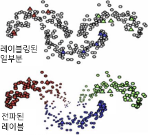 예를 들어, 위의 그림과 같이 그래프 기반 데이터가 있을 때, 이 그림에서 빨간색, 파란색, 녹색 삼각형과 회색 원으로 레이블이 지정되지 않은 많은 데이터를 볼 수 있습니다. 이 방법을 사용하면 인접 예제에 따라 레이블이 지정되지 않은 예제에 레이블을 할당합니다. 그런 다음 레이블은 색상별로 표시된 대로 나머지 군집으로 전파됩니다.