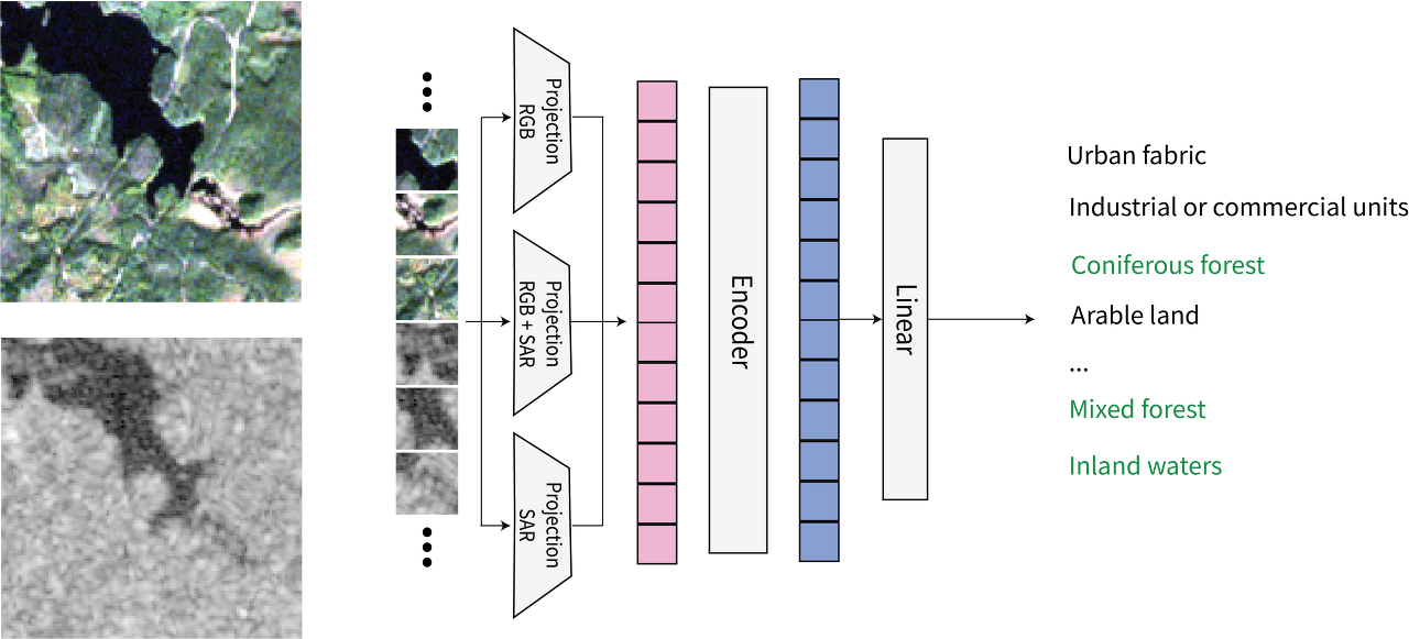 SAR이 EO 이미지와 현상학적으로 다른 데이터 소스임을 감안할 때, 비전 트랜스포머(ViT)는 컨볼루션 신경망에 내장된 스케일을 제거하고 불변 유도 bias를 이동시키기 때문에 SAR을 이용한 표현 학습에 특히 효과적인 아키텍처라는 것을 발견했습니다. RGB, SAR 및 공동 등록된 RGB + SAR에 대한 표현 학습을 위한 최고의 수행 방법인 MAERS는 Kaiming HE 등이 최근에 도입한 MAE(Masked Autoencoder)를 기반으로 합니다. 여기서 신경망은 데이터의 마스크 버전을 입력으로 취하고 데이터를 인코딩한 다음 이러한 방식으로 데이터를 디코딩하는 방법을 학습합니다. 이와 같은 방식으로 이 모델은 마스크되지 않은 입력 데이터를 재구성합니다.