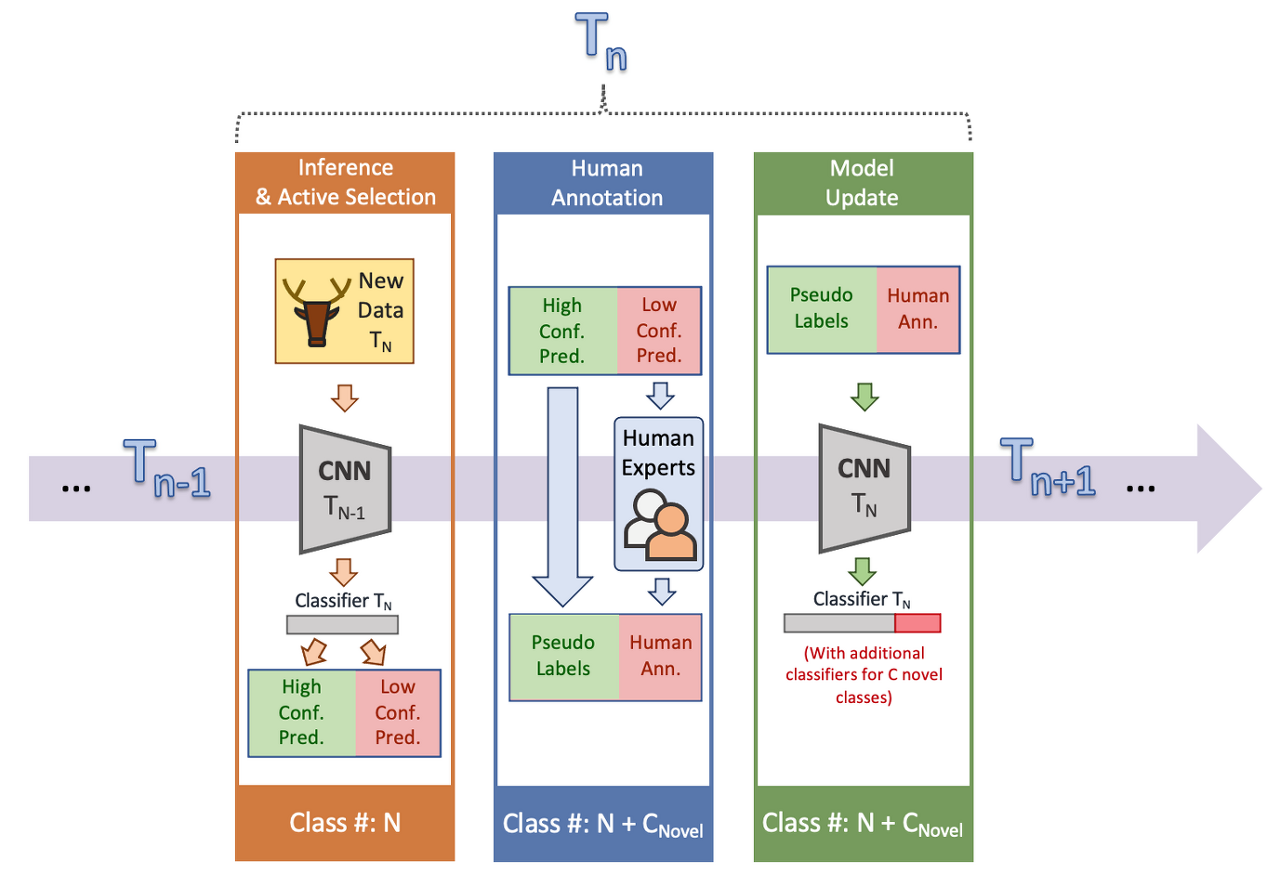 작년에 Nature-Machine Intelligence에 발표된 논문에서, 저자들은 HITL을 야생동물 인식에 통합하는 것에 대해 논의했고 단순한 테스트 성능 대신 모델 업데이트에서 인간의 노력 효율성을 조사할 것을 제안했습니다. 시연을 위해, 저자들은 능동 학습, 준지도 학습 및 HITL의 조합인 인식 프레임워크를 설계했습니다. 또한 인식 모델이 단일 시간 단계에서 멈추지 않았음을 나타내기 위해 시간 구성요소를 이 프레임워크에 통합했습니다. 일반적으로 프레임워크에서 새로운 데이터가 수집될 때마다 인식 모델은 예측 신뢰도 메트릭을 기반으로 Label을 달 데이터를 능동적으로 선택합니다. 신뢰도 예측이 낮을 때는 사람에게 직접 모델에 주석을 다는 작업을 하기 위해 전달되고, 신뢰도 예측이 높을 때는 다운스트림 작업 호은 모델 업데이트를 위한 유사 레이블(Pseudo-label)에 대한 믿음을 갖습니다.