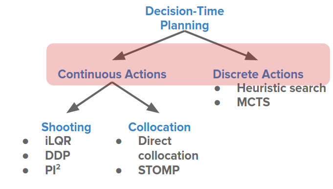 그러나 의사결정 시간 계획(Decision-Time Planning)의 경우, 이러한 구별은 이산 검색 또는 연속 궤적 최적화와 같은 이산 행동(Discrete Actions) 그리고 연속 행동(Continuous Action)에 대한 전문화된 방법을 이끌어냅니다.