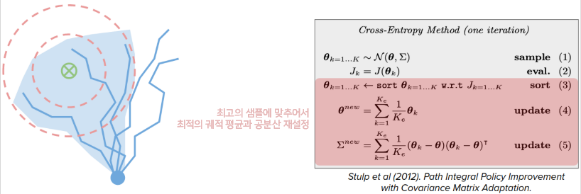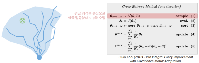 예를 들어, CEM에서는 최적 궤적을 유지하는 대신 최적 궤적의 평균과 공분산을 유지합니다.