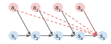 이는 각 상태가 암묵적으로 그 이전의 모든 행동에 의존한다는 것을 의미합니다. 이는 장기 기여도 부여(Long-term credit assignment)를 해치는 RNN의 폭발적/소멸적 그레이디언트 문제와 유사합니다. 그러나 RNN 학습과는 달리 환경에 의해 우리에게 요구되기 때문에 전이 함수를 변경할 수 없습니다.