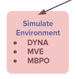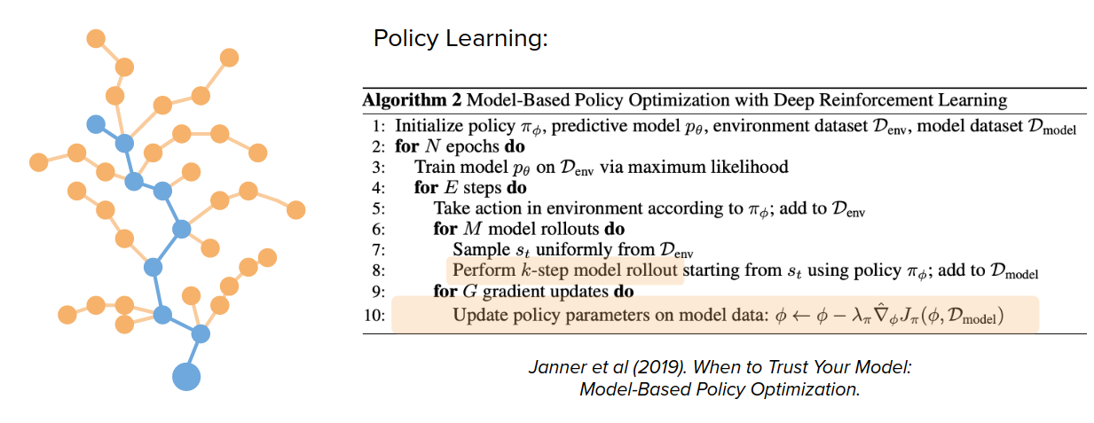 이는 정책 학습(Policy Learning)에도 적용될 수 있습니다. 실제 데이터에서 훨씬 더 멀리 떨어진 경험을 생성하고 이러한 가상 경험에 대한 정책 매개 변수 업데이트를 전적으로 수행하기 위해 모델에 따라 한 단계만 수행하는 것이 아니라 여러 단계를 수행할 필요가 있습니다.