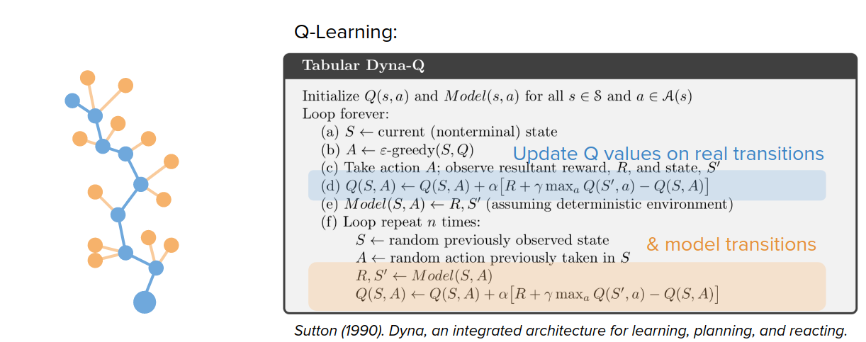 Dyna-Q는 학습된 모델과 함께 Q-러닝을 사용하는 예입니다. Dyna는 실제 전이(Transition)에 대한 기존 Q-러닝 업데이트를 수행하고 모델을 사용하여 실제 상태에서 가상의 전이를 생성하고 이러한 상태에 대해 동일한 Q-러닝 업데이트를 수행합니다. 그래서 기본적으로 경험을 늘리는 방법외에는 마땅한 방법이 없습니다.