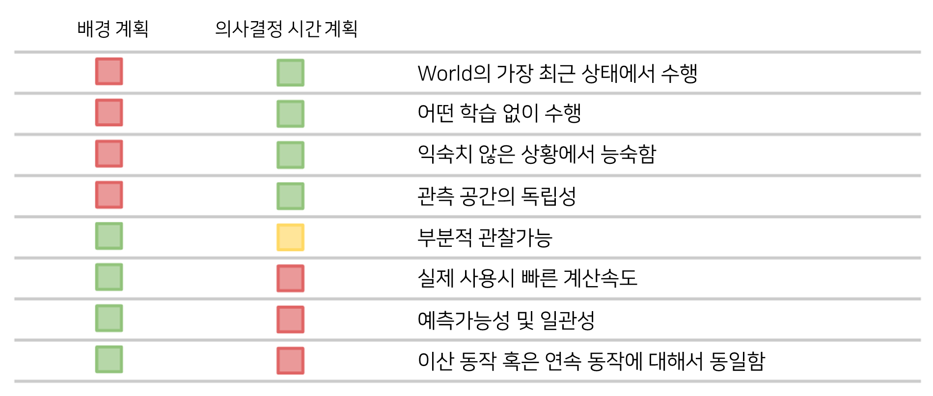 - 부분적 관찰 가능: 의사결정 시간 계획에는 몇 가지 문제가 있습니다. 이 계획은 여러분이 계획을 세울 때 여러분이 World의 모든 상태를 안다고 가정합니다. 그래서 의사결정 시간 계획에게 있어 정보를 숨기는 것은 어렵습니다. 가능은 하지만 비용이 더 많이 듭니다.