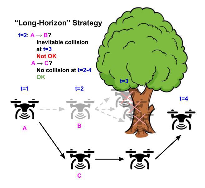 분포가 변화된 모델이 이용되는 것을 방지하기 위해 많은 학습 기반 제어 알고리즘은 에이전트가 오프라인 RL, 모델 기반 RL 및 모방 학습과 같은 저우도(low-likelihood) 행동을 취하거나 저우도 상태를 방문하는 것을 방지하기 위해 제어를 제한하거나 정규화합니다. 그러나 이러한 방법의 대부분은 다음 단계에서 드론이 추락하는 행동을 방지하여 자율 드론을 안전하게 유지하는 "탐욕" 전략과 유사하게 데이터 분포의 단일 단계 추정으로 제어를 제한합니다. 위의 예에서 보듯이, 이 전략은 드론이 미래의 또 다른 시간 단계에서 충돌(또는 OOD(Out-of-distribution)하지 않도록 보장하기에 충분하지 않습니다.