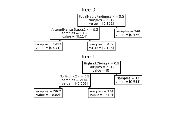 FIGS 사용하는 것은 매우 간단합니다. imodels 패키지(pip install imodels)를 통해 쉽게 설치할 수 있으며 표준 sickit-learn 모델과 동일한 방식으로 사용할 수 있습니다. 분류기 또는 회귀기를 가져오고 적합(fit) 및 예측(predict) 방법을 사용합니다. 다음은 대상이 경추 손상 위험(CSI)인 샘플 임상 데이터셋에 사용하는 예제입니다.