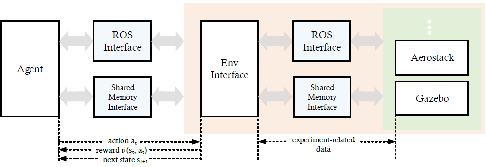 환경 인터페이스(Env Interface)는 에이전트와 시뮬레이션(Aerostack, Gazebo)와 상호작용할 수 있도록 위치하고 에이전트의 행동 \(a_t\)에 대해 시뮬레이션에서 나온 결과값인 보상 \(r_t\)를 전달받습니다. 이 과정에서 ROS 인터페이스를 통해 에이전트와 시뮬레이션이 통신을 수행하며, Gazebo 시뮬레이션이 일시적으로 중단되었을 때, 공유 메모리 인터페이스를 통하여 지속적으로 학습을 할 수 있도록 설계되어 있습니다.