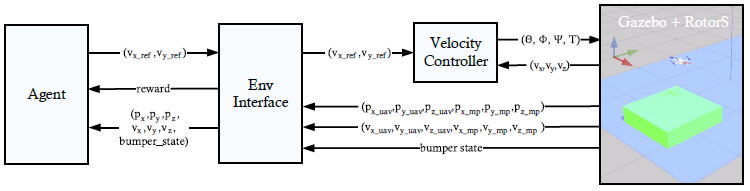이 때, \(p_x, p_y, p_x\)는 시간 \(t\)일 때 움직이는 플랫폼(Moving Platform)에 대한 UAV의 공간좌표이며, \(v_x, v_y\)는 시간 \(t\)일 때 움직이는 플랫폼에 대한 UAV의 속도를 나타내며, \(C\)는 움직이는 플랫폼에 달려있는 압력 센서의 상태를 나타내는 이진값(0 혹은 1)입니다. 에이전트는 환경 인터페이스로부터 상태 s와 보상 r을 받으며 해당 값을 통하여 환경 인터페이스에 행동값을 전달합니다.
