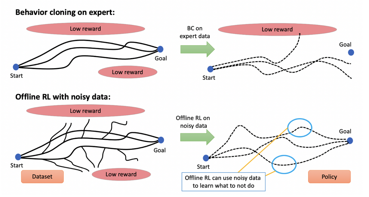 오프라인 RL은 에이전트에게 '하지 말아야 할 일'을 알려줄 수 있습니다. 오프라인 RL 알고리즘의 가장 큰 장점 중 하나는 확률론적 정책에서 생성된 잡음이 많은 데이터 셋에서 RL을 실행하면 에이전트에게 수익을 극대화하기 위해 무엇을 해야 하는지 알려줄 뿐만 아니라 하지 말아야 할 일과 특정 상태에서의 행동이 향후 에이전트가 바람직하지 않은 시나리오에 처할 가능성에 어떤 영향을 미치는지도 알려줄 수 있다는 점입니다. 반면, 조건부 또는 가중치 BC는 보상이 적거나 안전하지 않은 행동을 명시적으로 금지하지 않고 "X를 하라"는 정책만 가르치는 형태입니다. 이는 특히 다양한 환경에서 로봇을 조작하거나 중환자실에서 환자 입원에 대한 결정을 내릴 때와 같이 무엇을 하지 말아야 하는지 명확하게 아는 것이 필수적인 오픈월드 환경과 관련이 있습니다. 이 논문에서는 '하지 말아야 할 것과 얼마나 아픈지'를 정확하게 추론함으로써 얻을 수 있는 이득을 정량화하고 이러한 직관을 아래 그림으로 설명합니다. 시뮬레이터(예: 로봇 공학, 자율 주행)에서 생성된 추가 '네거티브' 또는 '가짜 데이터'로 전문가 데모 데이터를 보강하거나, 먼저 모방 학습 방법을 실행하고 모방 학습 정책의 평가 롤아웃으로 데이터를 보강하는 오프라인 RL용 데이터 셋을 생성하여 이러한 노이즈 데이터를 쉽게 확보할 수 있습니다.