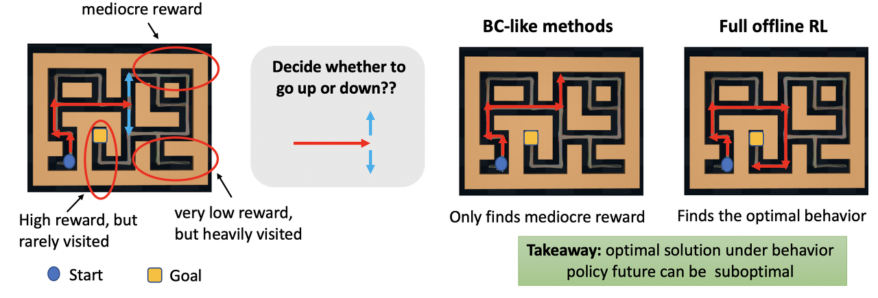 자연스럽게 다음과 같은 질문을 할 수 있습니다. BC 메서드에 RL과 유사한 구성 요소를 추가하여 이 문제를 해결할 수 있을까요? 최근에 연구된 단계별 접근 방식은 행동 복제(Behavior Cloning)를 넘어 제한된 수의 정책 개선 절차를 수행하는 것입니다. 즉, 전체 오프라인 RL은 최적의 정책을 찾을 때까지 여러 차례의 정책 개선을 수행하지만, 행동 복제를 넘어서는 정책 개선 단계를 한 번만 실행하면 정책을 찾을 수 있습니다. 이 정책 개선은 일종의 가치 함수를 통합하여 수행되며, Bellman 백업을 활용하면 이 방법이 " 연결" 기능을 갖출 수 있을 것으로 기대할 수 있습니다. 안타깝게도 이 접근 방식조차도 오프라인 RL과의 격차를 완전히 좁힐 수는 없습니다. 왜냐하면 단계별 접근 방식은 경로 구간을 연결할 수는 있지만, 종종 잘못된 구간을 연결할 수 있기 때문입니다! 정책 업데이트가 향후 결과에 미치는 영향을 고려하지 않고 근시안적으로 정책을 개선하는 경우, 정책은 진정한 최적의 행동을 식별하지 못할 수 있습니다. 예를 들어, 아래 표시된 미로 예제에서 에이전트가 목표를 향해 이동하는 것보다 위쪽으로 이동하여 중간 정도의 보상을 받는 솔루션을 찾는 것이 더 나은 것처럼 보일 수 있는데, 이는 행동 정책 상으로는 아래쪽으로 이동하는 것이 최선이라고 볼 수 없기 때문입니다.
