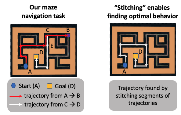 오프라인 RL 방식은 A에서 D까지의 경로를 발견할 수 있지만, 다양한 모방 스타일 방식은 그렇지 못하다는 것이 확인되었습니다. 이는 오프라인 RL 알고리즘이 차선의 경로를 함께 "연결(Stitch)"할 수 있기 때문입니다. 오프라인 데이터셋의 궤적 \(\tau_i\)는 저조한 리턴값을 달성할 수 있지만 양호한 경로들을를 결합하여 더 나은 정책을 얻을 수 있습니다(A→E + E→D = A→D). 경로들을 일시적으로 연결할 수 있는 이 가능성은 Bellman 백업을 활용하는 가치 기반 오프라인 RL 알고리즘의 특징이지만, 데이터 또는 경로 수준 시퀀스 모델의 클로닝(부분 집합)은 오프라인 데이터셋에서 A에서 D까지의 단일 궤적이 관찰되지 않기 때문에 이 정보를 추출할 수 없습니다!