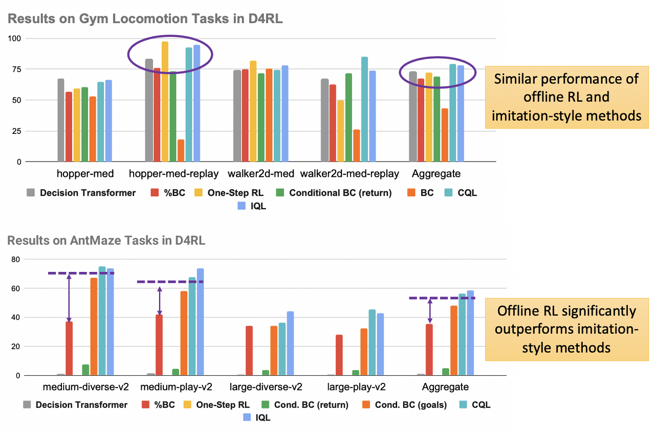 먼저 벤치마크 작업에서 오프라인 RL 및 모방 학습 방법의 성능을 검토해 보는 것이 시작하기에 좋은 출발점이 될 수 있습니다. 아래 그림에서는 D4RL 벤치마크의 하위 집합에서 오프라인 데이터로부터 학습하는 몇 가지 최신 방법의 성능을 살펴보겠습니다.