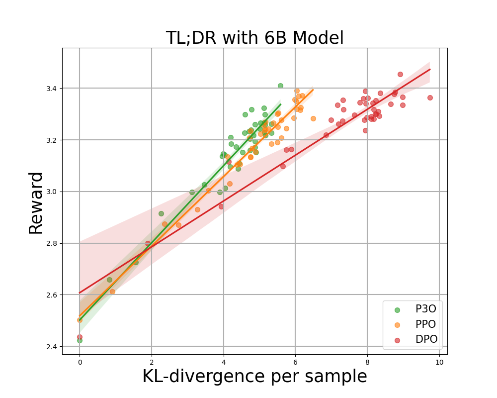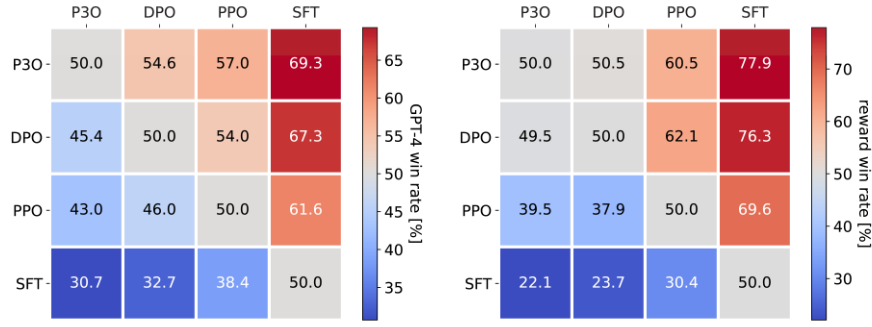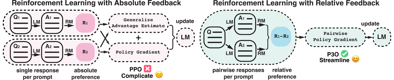 이러한 배경을 고려할 때 흥미로운 질문이 생겨납니다: 과연 비교 방식으로 학습하는 RL 알고리즘을 설계할 수 있을까요? 이를 탐구하기 위해 RLHF의 보상 학습 단계와 RL 미세 조정 단계의 학습 프로세스를 조화롭게 조정하여 이 문제에 대한 만족스러운 해결책을 제공하는 쌍방향 근사 정책 최적화(Pairwise Proximal Policy Opyimization, P3O)를 소개합니다.