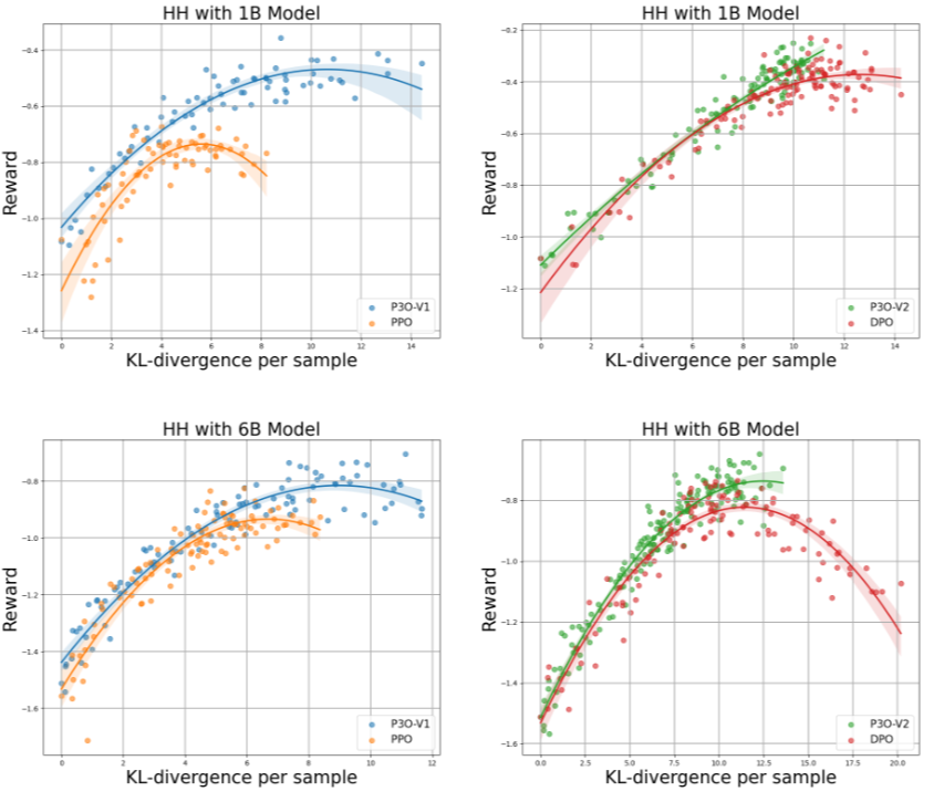 참조 정책에서 너무 많이 벗어나면 이전 연구에서 지적한 것처럼 온라인 정책이 보상 모델의 일부분을 잘라내어 일관성 없는 연속성을 만들 수 있습니다. 우리는 RL 이론에서 잘 확립된 지표인 보상뿐만 아니라 학습된 정책이 초기 정책에서 얼마나 벗어났는지를 KL-편차로 측정하는 데에도 관심이 있습니다. 따라서 달성한 보상 프론티어와 기준 정책과의 KL-편차를 기준으로 각 알고리즘의 효율성을 조사합니다(KL-Reward Frontier). 위 그림과 아래 그림을 보면, 다양한 모델 규모에 걸쳐 P3O가 PPO와 DPO보다 훨씬 우세한 프론티어를 가지고 있음을 알 수 있습니다.