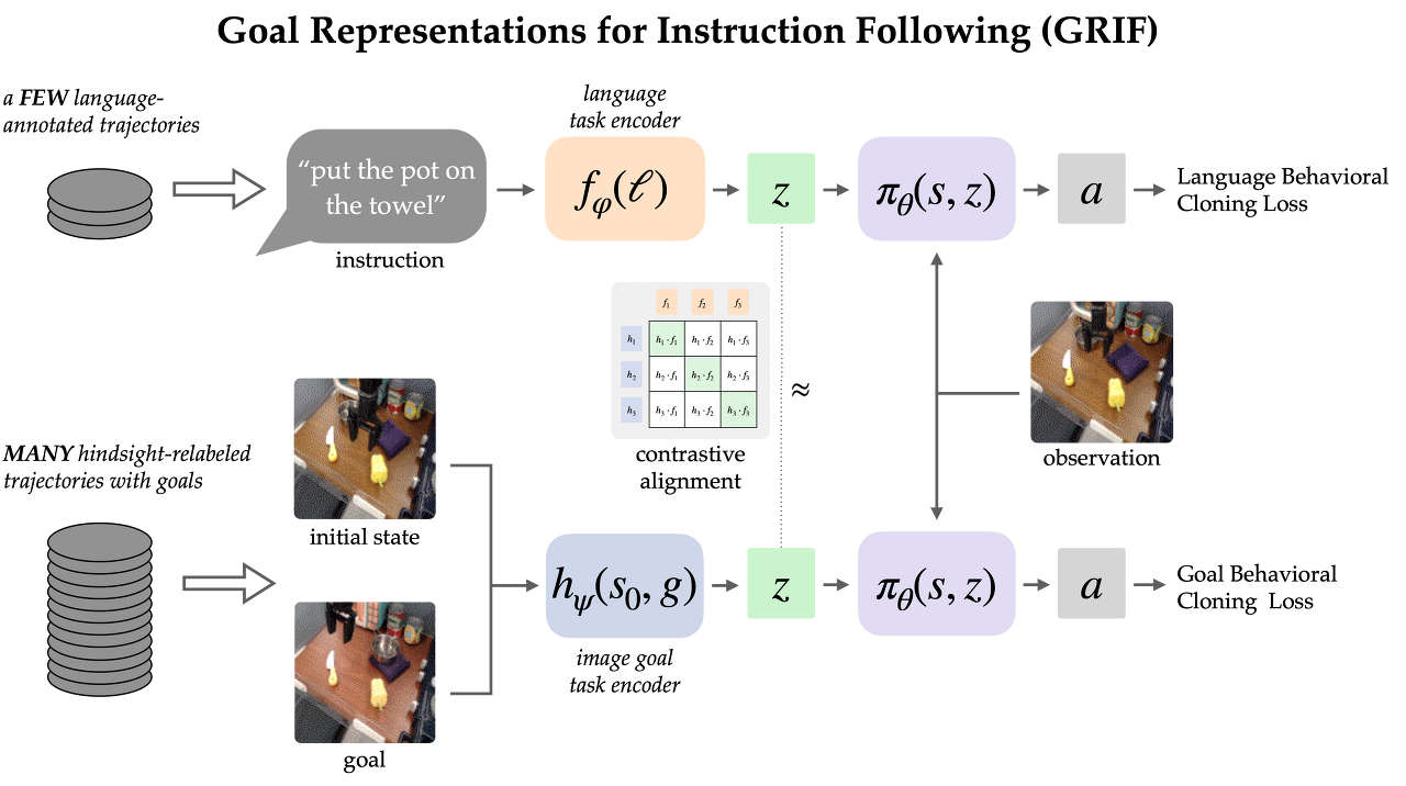 GRIF를 사용하면 로봇이 대량의 레이블이 없는 경로 데이터를 활용하여 목표 조건부 정책을 학습할 수 있으며, 정렬된 언어-목표 작업 표현을 통해 이러한 정책에 대한 '언어 인터페이스'를 제공할 수 있습니다. 이전의 언어-이미지 정렬 방법과 달리, 우리의 표현은 상태의 변화를 언어에 정렬하며, 이는 표준 CLIP 스타일의 이미지-언어 정렬 목표에 비해 상당한 개선을 이끌어냅니다. 실험을 통해 우리의 접근 방식이 레이블이 없는 로봇 경로를 효과적으로 활용할 수 있으며, 언어 주석이 달린 데이터만 사용하는 기준과 방법보다 성능이 크게 개선되었음을 입증했습니다.