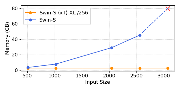 실험 결과, \(x\)T는 최첨단 기술*보다 영역당 훨씬 적은 메모리를 사용하면서도 더 적은 수의 파라미터로 모든 다운스트림 작업에서 더 높은 정확도를 달성할 수 있는 것으로 나타났습니다. 40GB A100으로 29,000 x 25,000픽셀 크기의 이미지를 모델링할 수 있는 반면, 동급 기술은 2,800 x 2,800픽셀로 메모리가 부족합니다.