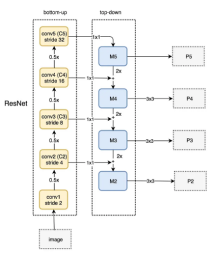 Oriented RPN은 FPN(Feature Pyramid Networks)로부터 5개의 특성값{ \(P_2\), \(P_3\), \(P_4\), \(P_5\), \(P_6\), }을 얻습니다. 이 때 P값은 이미지가 FPN에 입력되었을 때 아래의 그림과 같이 각 Level로부터 얻은 값이며, 두 번째 Level로부터 특성값을 받습니다. 첫 번째 Level(conv1)의 경우 메모리 사용량이 상당하여 제외합니다.